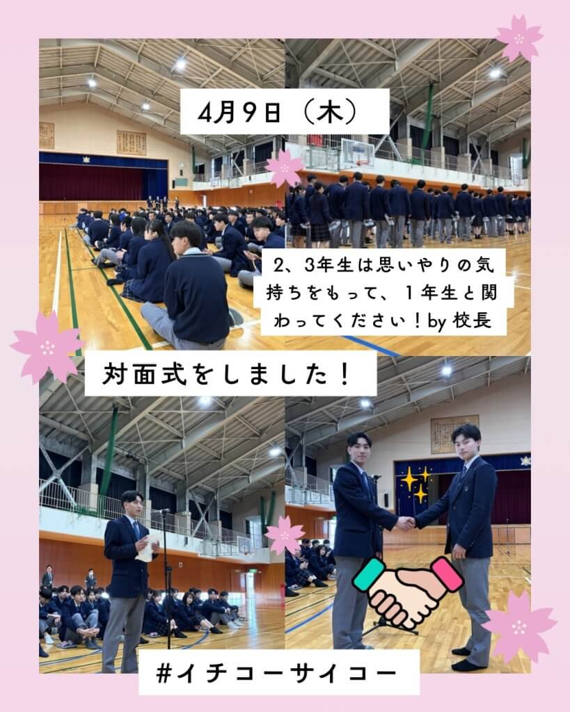 これから、行事や勉強・部活など協力して頑張っていきましょう。校長先生のお話の中に、2・3年生は、1年生に「思いやり」の気持ちをもって接してあげてほしいとありました。