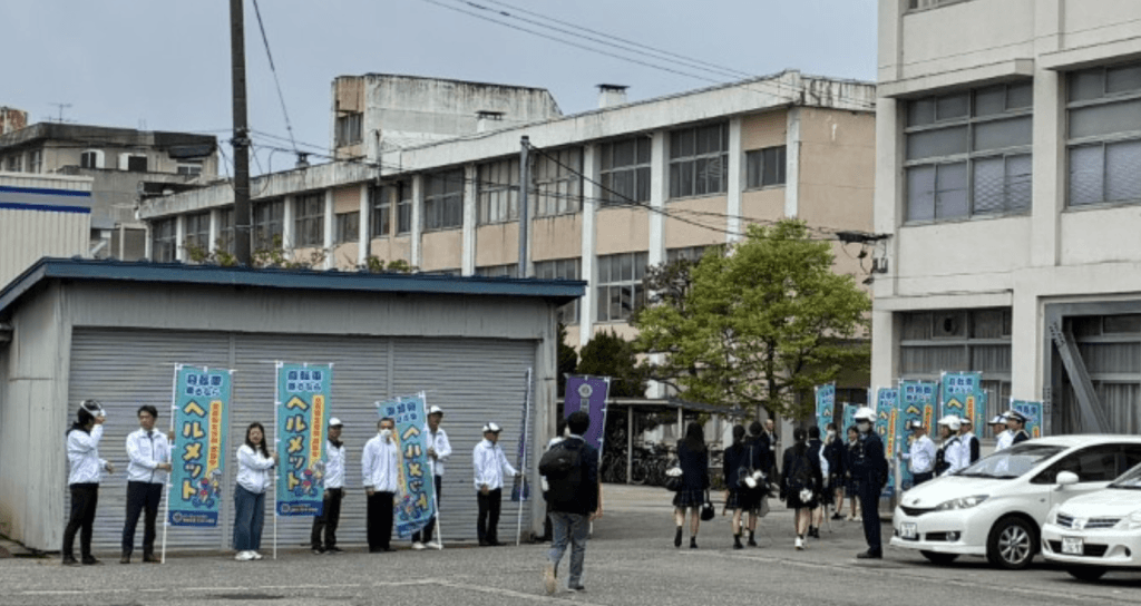 4月23日(木)朝8時から生徒玄関前でヘルメット着用運動を行いました。